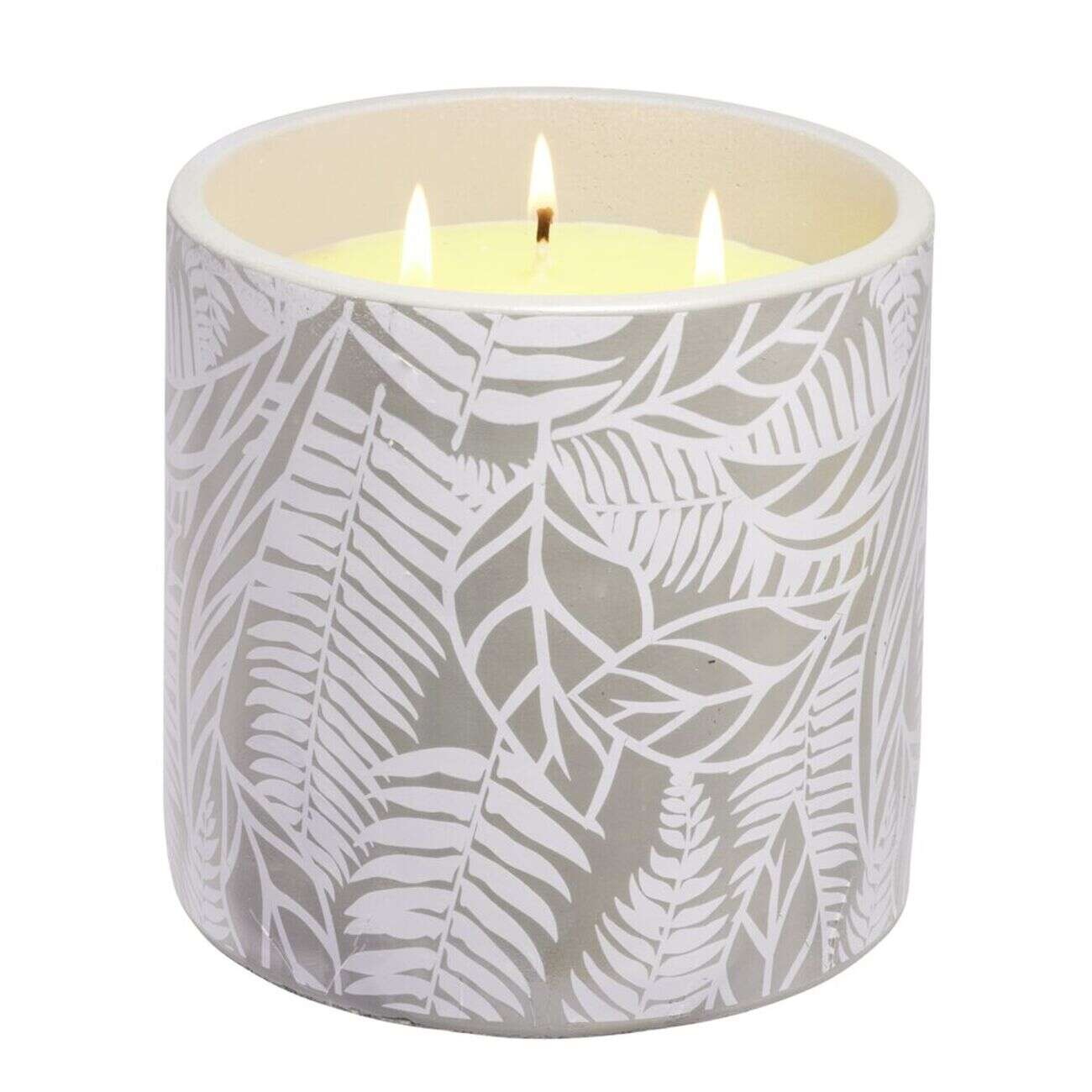 Bougie citronnelle dans pot de ciment imprimé feuillage