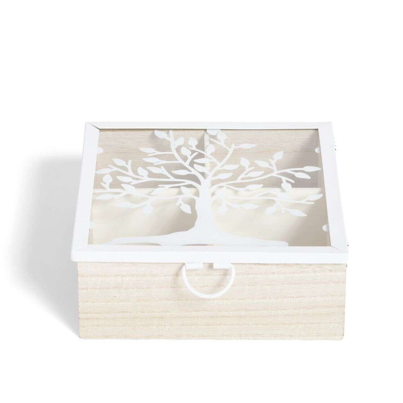 Boîte bois et métal beige et blanc motif arbre 16x16x6cm