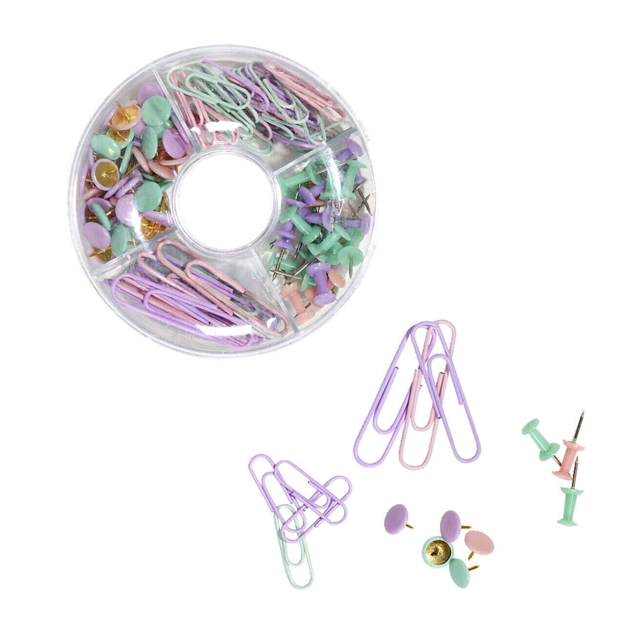 Boîte fournitures bureau avec punaises et trombones