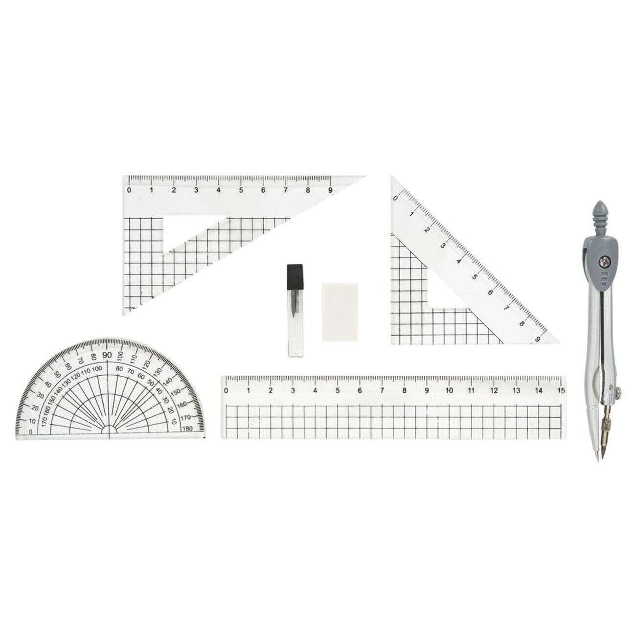 Kit complet compas règle équerre rapporteur 8 pièces