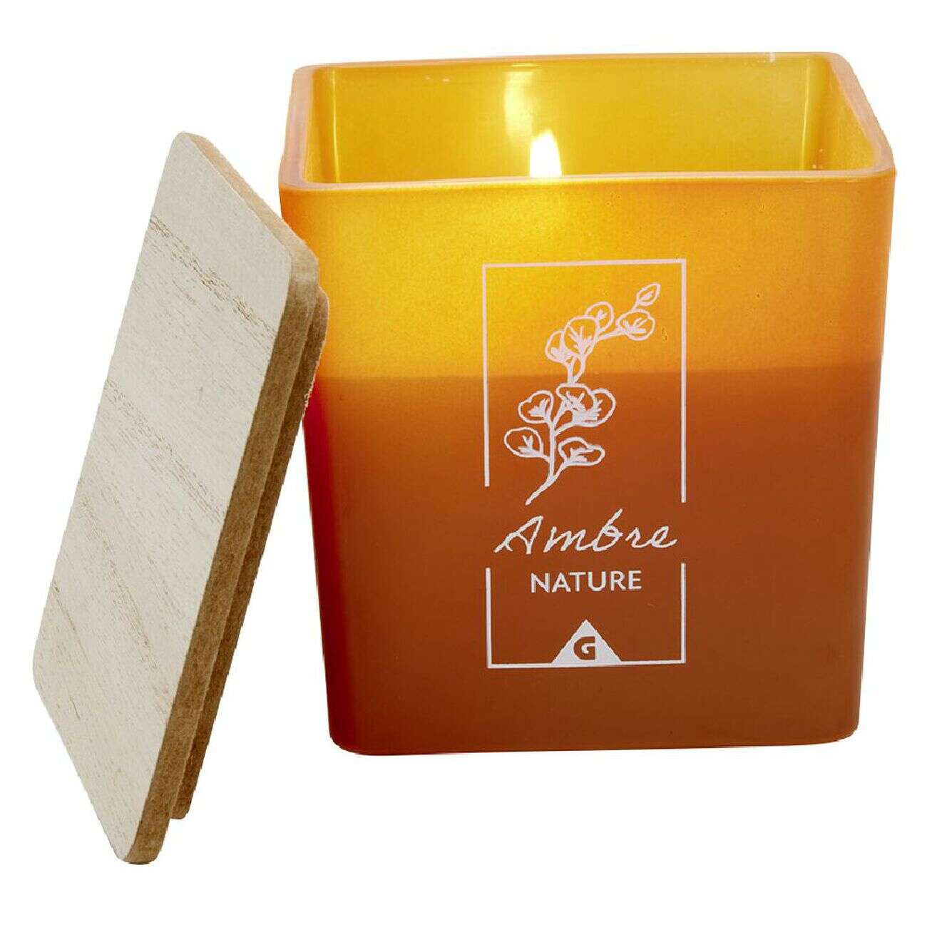 Bougie dans pot carré avec couvercle bois senteur ambre